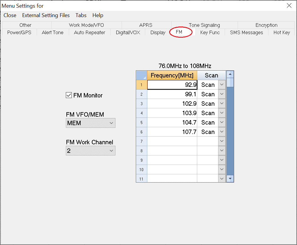 FM VFO/MEM – Select whether to select channels by manually tuning the radio to the specified frequency or scroll only the programmed memory channels.