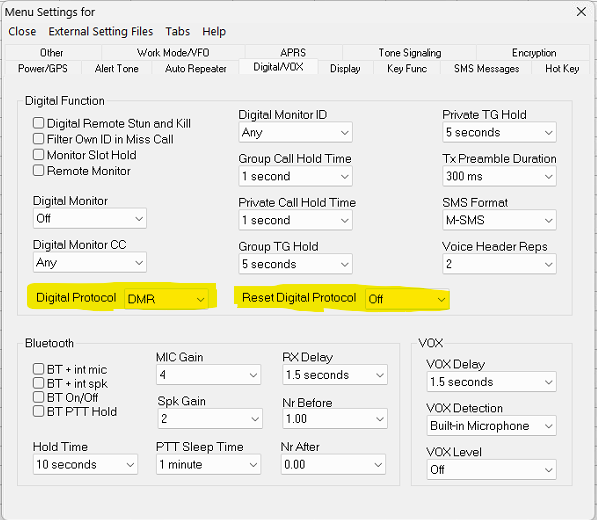 - To select on the radio: Menu > Settings > Radio Set > Other Func > Protocol